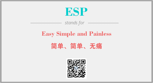 上述内容是“Easy Simple and Painless”作为“ESP”的缩写,解释为“简单、简单、无痛”时的信息,以及英文缩略词ESP所代表的英文单词,其对应的中文拼音、详细解释以及在英文中的流行度和相关分类、应用领域及应用示例等。
