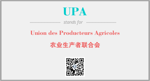 上述内容是“Union des Producteurs Agricoles”作为“UPA”的缩写,解释为“农业生产者联合会”时的信息,以及英文缩略词UPA所代表的英文单词,其对应的中文拼音、详细解释以及在英文中的流行度和相关分类、应用领域及应用示例等。
