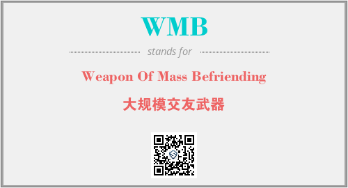 上述内容是“Weapon Of Mass Befriending”作为“WMB”的缩写,解释为“大规模交友武器”时的信息,以及英文缩略词WMB所代表的英文单词,其对应的中文拼音、详细解释以及在英文中的流行度和相关分类、应用领域及应用示例等。
