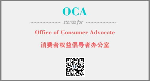 英文缩略词“OCA”经常作为“Office of Consumer Advocate”的英文缩写来使用,中文表示:“消费者权益倡导者办公室”。本文将详细介绍英文缩写词OCA所代表英文单词,其对应的中文拼音、详细解释以及在英语中的流行度。此外,还有关于缩略词OCA的分类、应用领域及相关应用示例等。