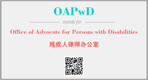 英文缩略词“OAPwD”经常作为“Office of Advocate for Persons with Disabilities”的英文缩写来使用,中文表示:“残疾人律师办公室”。本文将详细介绍英文缩写词OAPwD所代表英文单词,其对应的中文拼音、详细解释以及在英语中的流行度。此外,还有关于缩略词OAPwD的分类、应用领域及相关应用示例等。