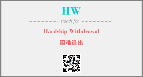 英文缩略词“HW”经常作为“Hardship Withdrawal”的英文缩写来使用,中文表示:“困难退出”。本文将详细介绍英文缩写词HW所代表英文单词,其对应的中文拼音、详细解释以及在英语中的流行度。此外,还有关于缩略词HW的分类、应用领域及相关应用示例等。