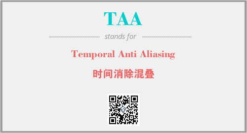 英文缩略词“TAA”经常作为“Temporal Anti Aliasing”的英文缩写来使用,中文表示:“时间消除混叠”。本文将详细介绍英文缩写词TAA所代表英文单词,其对应的中文拼音、详细解释以及在英语中的流行度。此外,还有关于缩略词TAA的分类、应用领域及相关应用示例等。