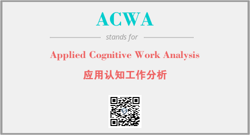 英文缩略词“ACWA”经常作为“Applied Cognitive Work Analysis”的英文缩写来使用,中文表示:“应用认知工作分析”。本文将详细介绍英文缩写词ACWA所代表英文单词,其对应的中文拼音、详细解释以及在英语中的流行度。此外,还有关于缩略词ACWA的分类、应用领域及相关应用示例等。