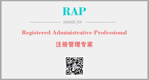 上述内容是“Registered Administrative Professional”作为“RAP”的缩写,解释为“注册管理专家”时的信息,以及英文缩略词RAP所代表的英文单词,其对应的中文拼音、详细解释以及在英文中的流行度和相关分类、应用领域及应用示例等。