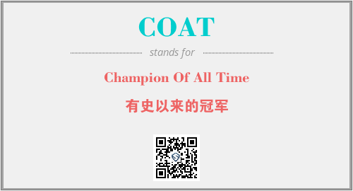上述内容是“Champion Of All Time”作为“COAT”的缩写,解释为“有史以来的冠军”时的信息,以及英文缩略词COAT所代表的英文单词,其对应的中文拼音、详细解释以及在英文中的流行度和相关分类、应用领域及应用示例等。