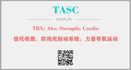 上述内容是“TRX; Abs; Strength; Cardio”作为“TASC”的缩写,解释为“信托收据;防抱死制动系统;力量有氧运动”时的信息,以及英文缩略词TASC所代表的英文单词,其对应的中文拼音、详细解释以及在英文中的流行度和相关分类、应用领域及应用示例等。
