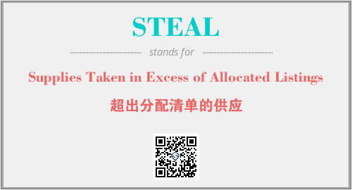 上述内容是“Supplies Taken in Excess of Allocated Listings”作为“STEAL”的缩写,解释为“超出分配清单的供应”时的信息,以及英文缩略词STEAL所代表的英文单词,其对应的中文拼音、详细解释以及在英文中的流行度和相关分类、应用领域及应用示例等。