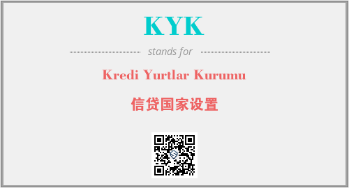 英文缩略词“KYK”经常作为“Kredi Yurtlar Kurumu”的英文缩写来使用,中文表示:“信贷国家设置”。本文将详细介绍英文缩写词KYK所代表英文单词,其对应的中文拼音、详细解释以及在英语中的流行度。此外,还有关于缩略词KYK的分类、应用领域及相关应用示例等。