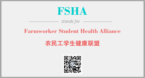 上述内容是“Farmworker Student Health Alliance”作为“FSHA”的缩写,解释为“农民工学生健康联盟”时的信息,以及英文缩略词FSHA所代表的英文单词,其对应的中文拼音、详细解释以及在英文中的流行度和相关分类、应用领域及应用示例等。