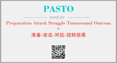 上述内容是“Preparation Attack Struggle Turnaround Outcome”作为“PASTO”的缩写,解释为“准备-攻击-对抗-扭转结果”时的信息,以及英文缩略词PASTO所代表的英文单词,其对应的中文拼音、详细解释以及在英文中的流行度和相关分类、应用领域及应用示例等。