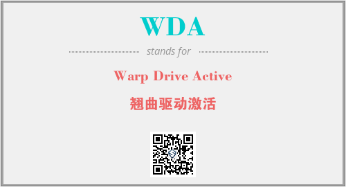 上述内容是“Warp Drive Active”作为“WDA”的缩写,解释为“翘曲驱动激活”时的信息,以及英文缩略词WDA所代表的英文单词,其对应的中文拼音、详细解释以及在英文中的流行度和相关分类、应用领域及应用示例等。