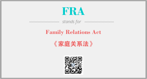上述内容是“Family Relations Act”作为“FRA”的缩写,解释为“《家庭关系法》”时的信息,以及英文缩略词FRA所代表的英文单词,其对应的中文拼音、详细解释以及在英文中的流行度和相关分类、应用领域及应用示例等。