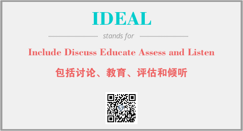 上述内容是“Include Discuss Educate Assess and Listen”作为“IDEAL”的缩写,解释为“包括讨论、教育、评估和倾听”时的信息,以及英文缩略词IDEAL所代表的英文单词,其对应的中文拼音、详细解释以及在英文中的流行度和相关分类、应用领域及应用示例等。