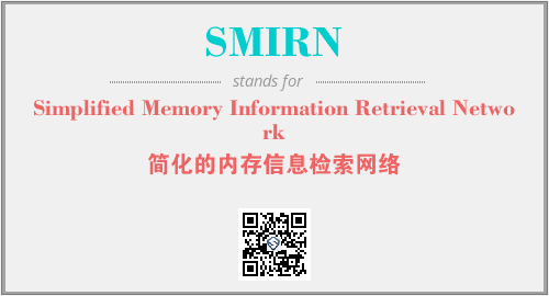 上述内容是“Simplified Memory Information Retrieval Network”作为“SMIRN”的缩写,解释为“简化的内存信息检索网络”时的信息,以及英文缩略词SMIRN所代表的英文单词,其对应的中文拼音、详细解释以及在英文中的流行度和相关分类、应用领域及应用示例等。