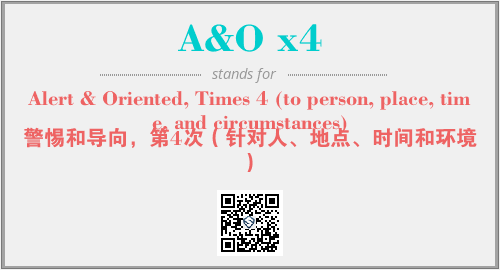 上述内容是“Alert & Oriented, Times 4 (to person, place, time, and circumstances)”作为“A&O x4”的缩写,解释为“警惕和导向,第4次(针对人、地点、时间和环境)”时的信息,以及英文缩略词A&O x4所代表的英文单词,其对应的中文拼音、详细解释以及在英文中的流行度和相关分类、应用领域及应用示例等。