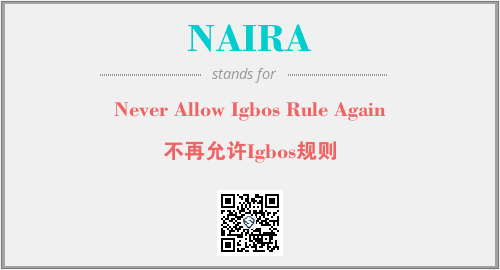 上述内容是“Never Allow Igbos Rule Again”作为“NAIRA”的缩写,解释为“不再允许Igbos规则”时的信息,以及英文缩略词NAIRA所代表的英文单词,其对应的中文拼音、详细解释以及在英文中的流行度和相关分类、应用领域及应用示例等。