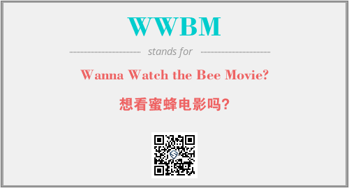 上述内容是“Wanna Watch the Bee Movie?”作为“WWBM”的缩写,解释为“想看蜜蜂电影吗?”时的信息,以及英文缩略词WWBM所代表的英文单词,其对应的中文拼音、详细解释以及在英文中的流行度和相关分类、应用领域及应用示例等。