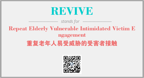 上述内容是“Repeat Elderly Vulnerable Intimidated Victim Engagement”作为“REVIVE”的缩写,解释为“重复老年人易受威胁的受害者接触”时的信息,以及英文缩略词REVIVE所代表的英文单词,其对应的中文拼音、详细解释以及在英文中的流行度和相关分类、应用领域及应用示例等。