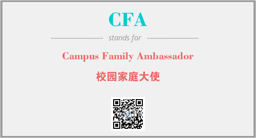 英文缩略词“CFA”经常作为“Campus Family Ambassador”的英文缩写来使用,中文表示:“校园家庭大使”。本文将详细介绍英文缩写词CFA所代表英文单词,其对应的中文拼音、详细解释以及在英语中的流行度。此外,还有关于缩略词CFA的分类、应用领域及相关应用示例等。