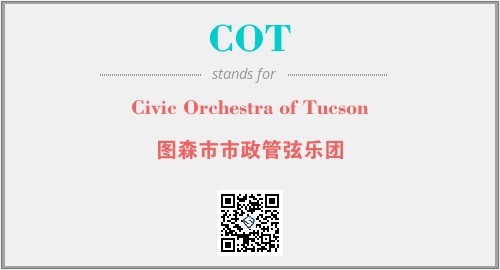 英文缩略词“COT”经常作为“Civic Orchestra of Tucson”的英文缩写来使用,中文表示:“图森市市政管弦乐团”。本文将详细介绍英文缩写词COT所代表英文单词,其对应的中文拼音、详细解释以及在英语中的流行度。此外,还有关于缩略词COT的分类、应用领域及相关应用示例等。