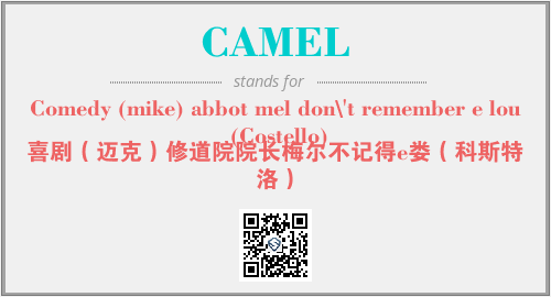 上述内容是“Comedy (mike) abbot mel don\'t remember e lou (Costello)”作为“CAMEL”的缩写,解释为“喜剧(迈克)修道院院长梅尔不记得e娄(科斯特洛)”时的信息,以及英文缩略词CAMEL所代表的英文单词,其对应的中文拼音、详细解释以及在英文中的流行度和相关分类、应用领域及应用示例等。