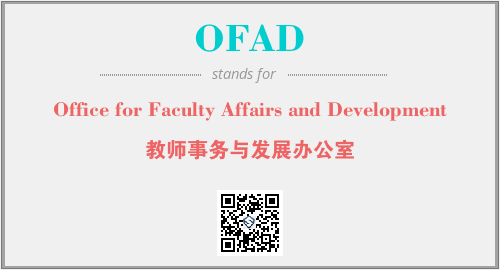 上述内容是“Office for Faculty Affairs and Development”作为“OFAD”的缩写,解释为“教师事务与发展办公室”时的信息,以及英文缩略词OFAD所代表的英文单词,其对应的中文拼音、详细解释以及在英文中的流行度和相关分类、应用领域及应用示例等。