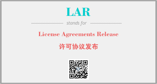 上述内容是“License Agreements Release”作为“LAR”的缩写,解释为“许可协议发布”时的信息,以及英文缩略词LAR所代表的英文单词,其对应的中文拼音、详细解释以及在英文中的流行度和相关分类、应用领域及应用示例等。