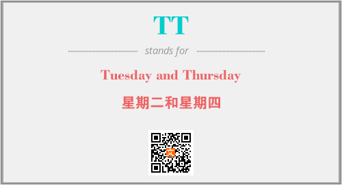 英文缩略词“TT”经常作为“Tuesday and Thursday”的英文缩写来使用,中文表示:“星期二和星期四”。本文将详细介绍英文缩写词TT所代表英文单词,其对应的中文拼音、详细解释以及在英语中的流行度。此外,还有关于缩略词TT的分类、应用领域及相关应用示例等。