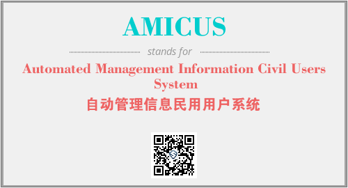 上述内容是“Automated Management Information Civil Users System”作为“AMICUS”的缩写,解释为“自动管理信息民用用户系统”时的信息,以及英文缩略词AMICUS所代表的英文单词,其对应的中文拼音、详细解释以及在英文中的流行度和相关分类、应用领域及应用示例等。