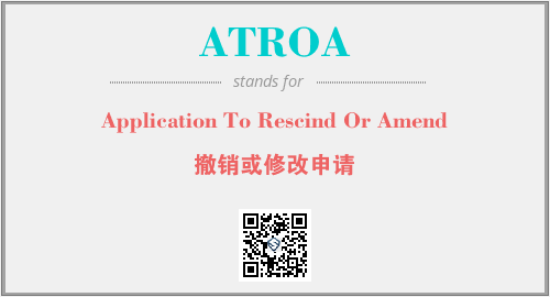 上述内容是“Application To Rescind Or Amend”作为“ATROA”的缩写,解释为“撤销或修改申请”时的信息,以及英文缩略词ATROA所代表的英文单词,其对应的中文拼音、详细解释以及在英文中的流行度和相关分类、应用领域及应用示例等。
