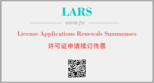 英文缩略词“LARS”经常作为“License Applications Renewals Summonses”的英文缩写来使用,中文表示:“许可证申请续订传票”。本文将详细介绍英文缩写词LARS所代表英文单词,其对应的中文拼音、详细解释以及在英语中的流行度。此外,还有关于缩略词LARS的分类、应用领域及相关应用示例等。