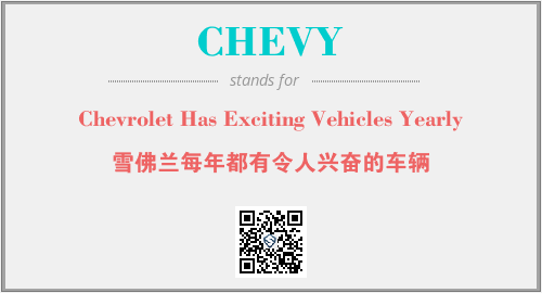 上述内容是“Chevrolet Has Exciting Vehicles Yearly”作为“CHEVY”的缩写,解释为“雪佛兰每年都有令人兴奋的车辆”时的信息,以及英文缩略词CHEVY所代表的英文单词,其对应的中文拼音、详细解释以及在英文中的流行度和相关分类、应用领域及应用示例等。