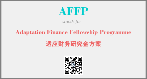 上述内容是“Adaptation Finance Fellowship Programme”作为“AFFP”的缩写,解释为“适应财务研究金方案”时的信息,以及英文缩略词AFFP所代表的英文单词,其对应的中文拼音、详细解释以及在英文中的流行度和相关分类、应用领域及应用示例等。
