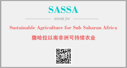 英文缩略词“SASSA”经常作为“Sustainable Agriculture for Sub Saharan Africa”的英文缩写来使用,中文表示:“撒哈拉以南非洲可持续农业”。本文将详细介绍英文缩写词SASSA所代表英文单词,其对应的中文拼音、详细解释以及在英语中的流行度。此外,还有关于缩略词SASSA的分类、应用领域及相关应用示例等。