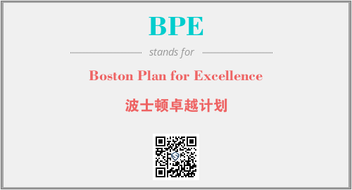 上述内容是“Boston Plan for Excellence”作为“BPE”的缩写,解释为“波士顿卓越计划”时的信息,以及英文缩略词BPE所代表的英文单词,其对应的中文拼音、详细解释以及在英文中的流行度和相关分类、应用领域及应用示例等。