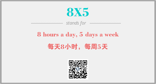 上述内容是“8 hours a day, 5 days a week”作为“8X5”的缩写,解释为“每天8小时,每周5天”时的信息,以及英文缩略词8X5所代表的英文单词,其对应的中文拼音、详细解释以及在英文中的流行度和相关分类、应用领域及应用示例等。