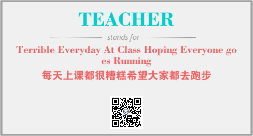 英文缩略词“TEACHER”经常作为“Terrible Everyday At Class Hoping Everyone goes Running”的英文缩写来使用,中文表示:“每天上课都很糟糕希望大家都去跑步”。本文将详细介绍英文缩写词TEACHER所代表英文单词,其对应的中文拼音、详细解释以及在英语中的流行度。此外,还有关于缩略词TEACHER的分类、应用领域及相关应用示例等。