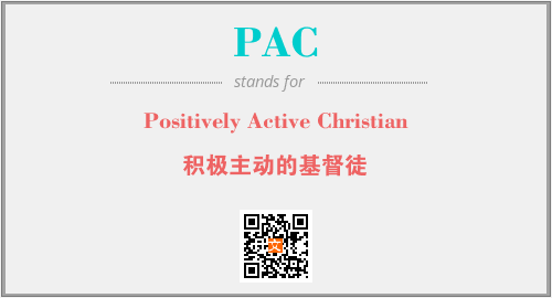 上述内容是“Positively Active Christian”作为“PAC”的缩写,解释为“积极主动的基督徒”时的信息,以及英文缩略词PAC所代表的英文单词,其对应的中文拼音、详细解释以及在英文中的流行度和相关分类、应用领域及应用示例等。