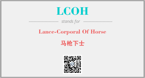 英文缩略词“LCOH”经常作为“Lance-Corporal Of Horse”的英文缩写来使用,中文表示:“马枪下士”。本文将详细介绍英文缩写词LCOH所代表英文单词,其对应的中文拼音、详细解释以及在英语中的流行度。此外,还有关于缩略词LCOH的分类、应用领域及相关应用示例等。