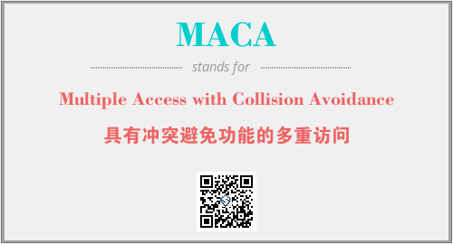 英文缩略词“MACA”经常作为“Multiple Access with Collision Avoidance”的英文缩写来使用,中文表示:“具有冲突避免功能的多重访问”。本文将详细介绍英文缩写词MACA所代表英文单词,其对应的中文拼音、详细解释以及在英语中的流行度。此外,还有关于缩略词MACA的分类、应用领域及相关应用示例等。