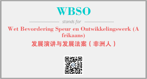 上述内容是“Wet Bevordering Speur en Ontwikkelingswerk (Afrikaans)”作为“WBSO”的缩写,解释为“发展演讲与发展法案(非洲人)”时的信息,以及英文缩略词WBSO所代表的英文单词,其对应的中文拼音、详细解释以及在英文中的流行度和相关分类、应用领域及应用示例等。