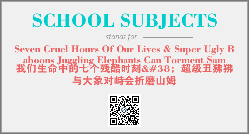 上述内容是“Seven Cruel Hours Of Our Lives & Super Ugly Baboons Juggling Elephants Can Torment Sam”作为“SCHOOL SUBJECTS”的缩写,解释为“我们生命中的七个残酷时刻&;超级丑狒狒与大象对峙会折磨山姆”时的信息,以及英文缩略词SCHOOL SUBJECTS所代表的英文单词,其对应的中文拼音、详细解释以及在英文中的流行度和相关分类、应用领域及应用示例等。