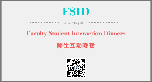 上述内容是“Faculty Student Interaction Dinners”作为“FSID”的缩写,解释为“师生互动晚餐”时的信息,以及英文缩略词FSID所代表的英文单词,其对应的中文拼音、详细解释以及在英文中的流行度和相关分类、应用领域及应用示例等。