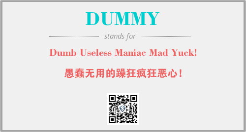 上述内容是“Dumb Useless Maniac Mad Yuck!”作为“DUMMY”的缩写,解释为“愚蠢无用的躁狂疯狂恶心!”时的信息,以及英文缩略词DUMMY所代表的英文单词,其对应的中文拼音、详细解释以及在英文中的流行度和相关分类、应用领域及应用示例等。