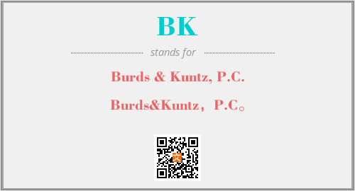上述内容是“Burds & Kuntz, P.C.”作为“BK”的缩写,解释为“Burds&Kuntz,P.C。”时的信息,以及英文缩略词BK所代表的英文单词,其对应的中文拼音、详细解释以及在英文中的流行度和相关分类、应用领域及应用示例等。