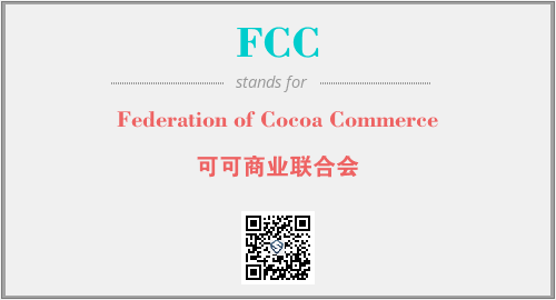 上述内容是“Federation of Cocoa Commerce”作为“FCC”的缩写,解释为“可可商业联合会”时的信息,以及英文缩略词FCC所代表的英文单词,其对应的中文拼音、详细解释以及在英文中的流行度和相关分类、应用领域及应用示例等。