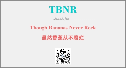 上述内容是“Though Bananas Never Reek”作为“TBNR”的缩写,解释为“虽然香蕉从不腐烂”时的信息,以及英文缩略词TBNR所代表的英文单词,其对应的中文拼音、详细解释以及在英文中的流行度和相关分类、应用领域及应用示例等。