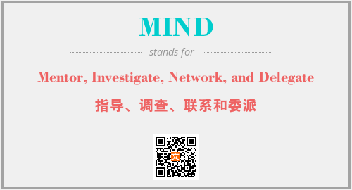 上述内容是“Mentor, Investigate, Network, and Delegate”作为“MIND”的缩写,解释为“指导、调查、联系和委派”时的信息,以及英文缩略词MIND所代表的英文单词,其对应的中文拼音、详细解释以及在英文中的流行度和相关分类、应用领域及应用示例等。
