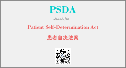 上述内容是“Patient Self-Determination Act”作为“PSDA”的缩写,解释为“患者自决法案”时的信息,以及英文缩略词PSDA所代表的英文单词,其对应的中文拼音、详细解释以及在英文中的流行度和相关分类、应用领域及应用示例等。